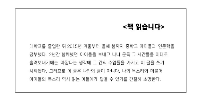 | 차명식의 『일요일 오후 2시, 동네 청년이 중학생들과 책 읽습니다』이 출간되었습니다! (0) | 2019.07.02 |