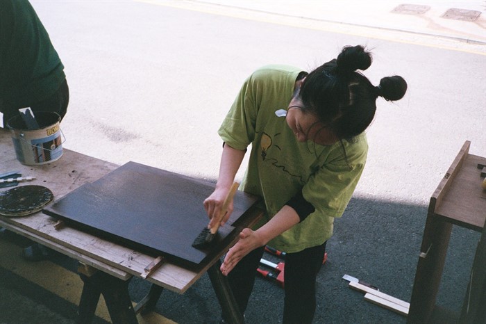 김목수가 나무에 페인트 칠을 하는 모습을 아무리 봐도 나는 김목수의 붓질을 그대로 따라할 수는 없다. 팔 근육이 다르고, 키도 조금 다르며, 무엇보다 경험치에서 차이나기 때문이다. 그러나 나는 어설프게나마 김목수와 비슷한 시도를 해보면서 나에게 맞는 붓질하는 방법을 찾아냈다. 느린 속도 때문에 페인트가 굳을까봐 페인트의 양을 늘리고, 부정확한 붓질 실력과 부족한 힘을 보완하기 위해 등과 배의 힘을 더해 칠했다. 그러나 그보다 중요한 것은 나무에 페인트 칠을 할 때 ‘왜’ 집중해야하는지를 알게 되었다는 점이다. 팔은 몸통을 중심으로 콤파스처럼 원을 그리며 움직이지만, 나무결은 일자로 나있다. 따라서 결에 맞춰 칠을 하는 과정은 습관적인 내 움직임에 변칙을 만드는 것이기도 하고, 나무의 결과 표면의 까칠함, 페인트를 먹는 정도를 확인하며 나무를 느끼는 일이기도 하다.