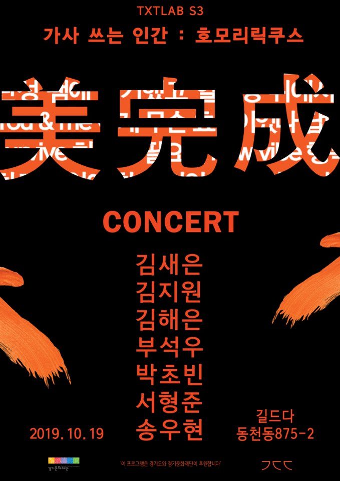 바로 미완성 콘서트가 열렸습니다! 공연 이름이 왜 미완성이냐고 물으신다면... 저희의 수업은 랩 중에서도 '가사'를 중점으로 진행됐는데요, 사실 가사만 봐서는 어떤 노래인지, 이게 랩인지 트로트인지 알 수 없습니다. 직접 뱉으면서 말들과 플로우가 전달이 되어야만 가사가 완성된다고 생각합니다. 그래서 아직 미未완성이었고, 관객분들! 여러분들을 만나서 아름다운美 완성을 할 수 있었습니다. 다시 한번 저희들의 가사를 완성시킬 수 있게 찾아와 들어주신 모든 분들께 감사하단 말씀 드립니다.