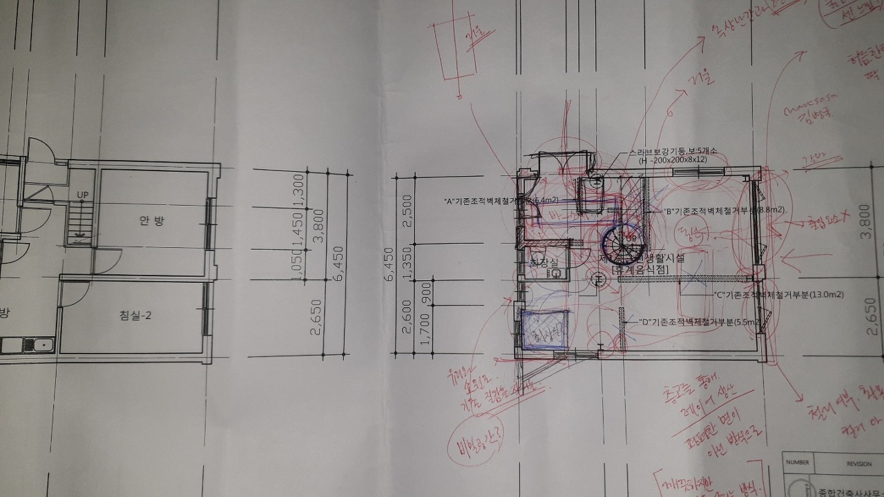 ③석운동-원효로 꽃술: 원효로의 한 건물을 리모델링할 때의 도면을 소개하고 싶다. 내가 도면을 그릴 당시 가장 큰 어려움을 겪었던 현장이다. 건축가의 도면은 “공사 현장을 벗어나” 그려진다고 들뢰즈와 가타리는 말했다. 반면 이청호 소장의 경우와 마찬가지로 동업 조합원들은 현장에서, 막 지어지고 있는 건축물 앞에서, 땅위에 그린다. 이 건물의 리모델링의 어려움은 도저히 공사 현장을 벗어날 수 없다는 데에 있었다. 매일매일 건물을 뜯어낼 때마다 새로운 것들이 발견되었다. 건축주는 새롭게 나타나는 것들을 없애고, 폭력적으로 재개발할 마음이 없었고, 그것들로부터 아이디어를 얻고 싶었다. 건축가의 도면은 백지상태를 가정한다. 그러나 우리는 도저히 백지상태에서 시작할 수가 없는 것이다. 도면은 수정에 수정을 가하고, 다양한 의견들이 겹쳐지고 떼가 묻으며 겹겹이 된다. 더 이상 제도는 무의미하며, 무작위로 보이는 선들이 건물의 방향을 결정했다. 결과적으로 정제된 도면은 건축물대장이란 필요에 의해 작성되었지만, 원효로의 이 건물을 실재하게 한 것은 내 생각엔 이 지저분한 선들이었다.