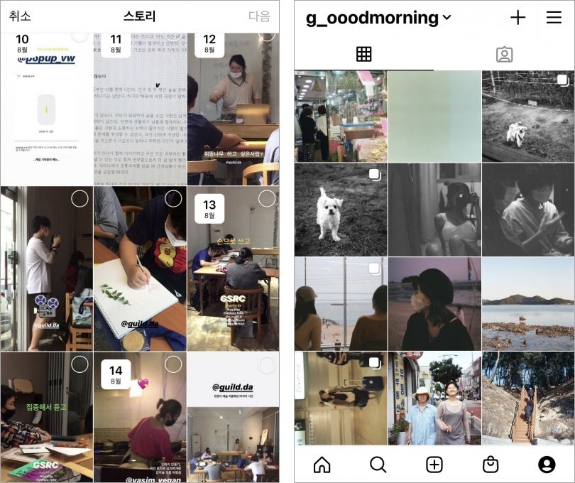 본격적으로 SNS를 사용한 건 길드다 계정의 운영을 맡으면서부터였다. SNS는 또래와 만날 수 있는 중요한 창구다. 힙한 사진을 얻기 위해 몇 번이고 셔텨를 눌렀고, 그럴싸한 게시글을 이틀에 한 번씩 올렸다. 길드다 계정과 나의 불편한 마음은 같이 성장해갔다. 사람들의 시선을 지나치게 의식했기 때문에 자의식이 비대해진 것 같았다. 사람들의 시선을 덜 의식하기 위해 개인 계정을 만들었다. 좋아요와 댓글 기능을 거의 사용하지 않았고, 게시글을 올릴 때도 중요한 내용을 담지 않았다. 나의 계정은 일기장이 되었고, SNS 관계는 협소해졌다.