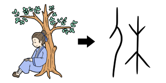 왼쪽에 있는 모양(亻)과 오른쪽에 있는 모양(木)을 각각 설명해드리겠습니다. 인(亻)은 사람을 의미하고, 목(木)은 나무를 본뜬 모양입니다. 오늘 배울 한자는 이 두 한자가 합쳐진 휴(休)라는 한자입니다. 과연 어떤 의미가 있을까요? 상상해봅시다. 사람과 나무가 같이 있으니, 나무꾼이라고 생각할 수도 있고, 사람만 한 나무, 혹은 나무만 한 사람이라는 뜻이라고 생각할 수도 있을 것 같아요.