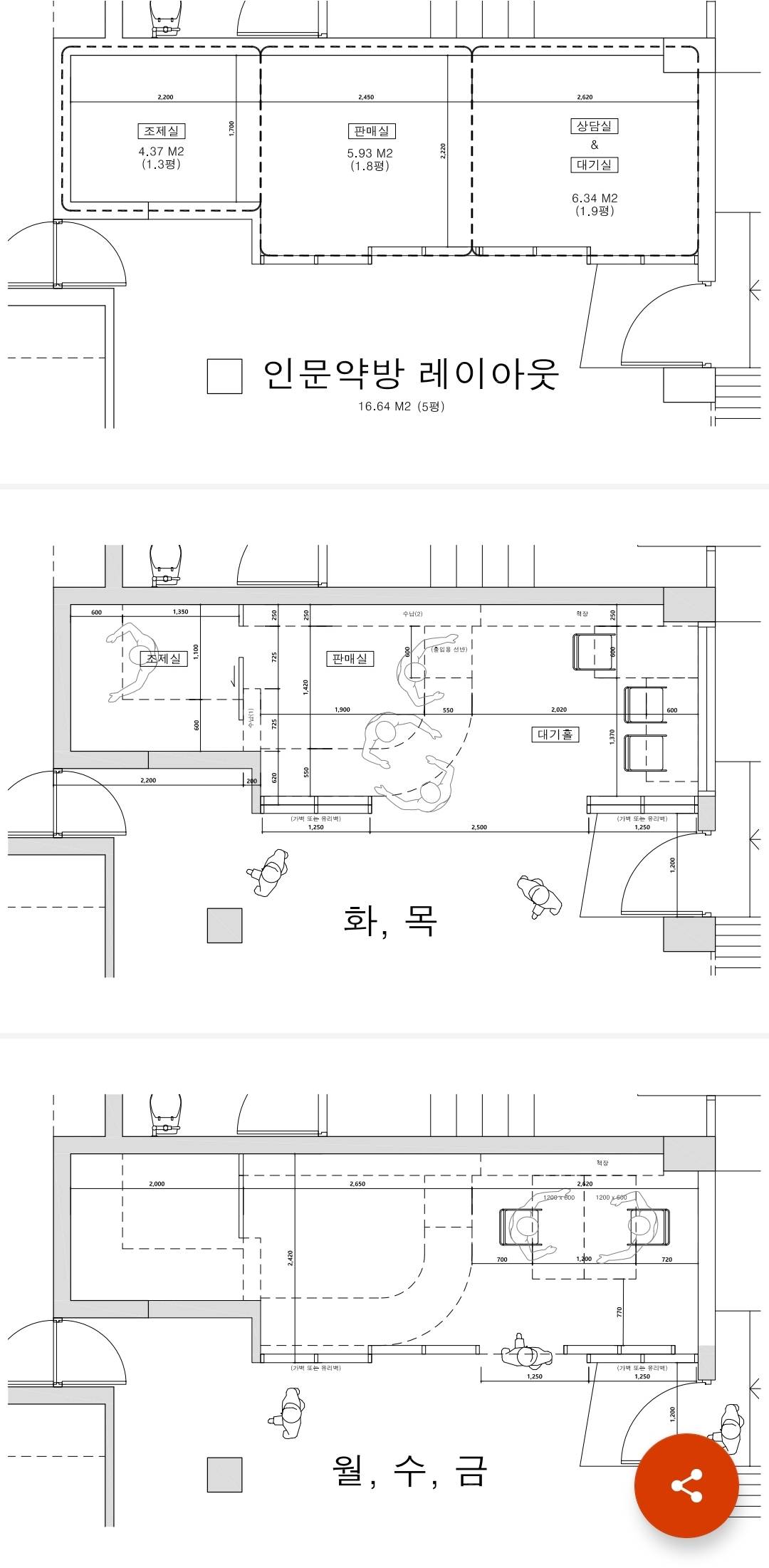회의에선 필요와 그에 따른 구획을 중심으로 논의가 이루어졌다. 약국엔 조제실이 필요하고, 조제실엔 어떤 기계가 들어가고, 약국의 운영진인 둥글레, 겸목, 기린의 욕망에 따라 테이블과 책장, 약장의 대략적인 배치가 이루어졌다. 필요한 수납의 양은 정해져 있었고, 그 외의 디자인적인 부분에서 고집스러운 사람은 없었다. 한정된 파지사유 공간에 각기 다른 욕망이 섞여들며 구획을 정하기까지 적잖은 시간이 소요되었지만, 공간 회의를 해봤던 경험 때문인지, 세미나로 다져진 토론 능력과 공동체 10년의 양보와 의견 조율의 경험 때문인지, 이렇다 할 갈등은 없었다.