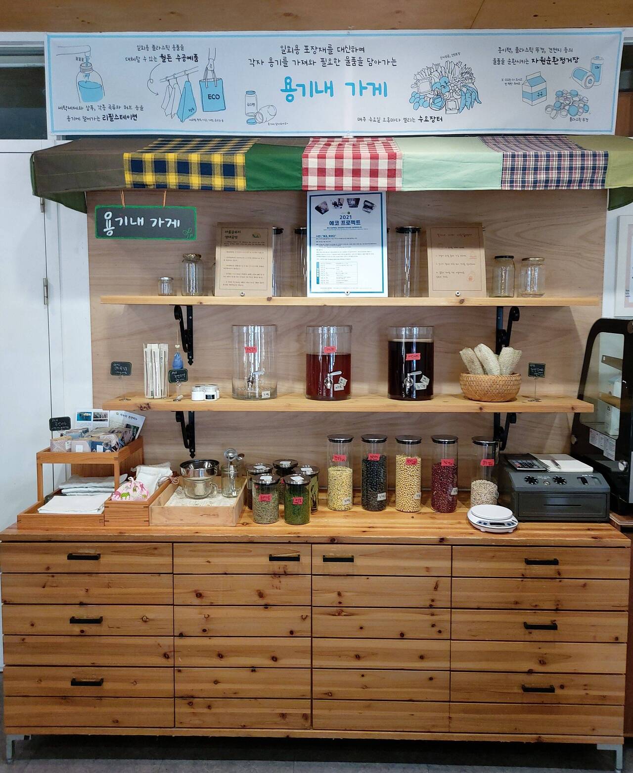 나는 바쁘게 현장들을 돌다가, 내가 만들어‘주려’ 했던 파지사유 공간이 어떻게 활용되고 있을지 궁금했다. 약간의 두려움, 그리고 약간의 기대를 가지고 파지사유를 들렀다. 또 포스터가 붙었을까? 용기내 가게의 천은 걸렸을까?…처음 눈에 들어온 것은 역시 일리치 약국이었다. 그 수많은 요구들에도 불구하고 어느 정도 내 디자인이 있었다. 그리고 들어선 파지사유에는 마침내 어닝 천이 걸린 용기내 가게가 있었다. 난 잠시서서 그곳을 바라보았다. 그런데, 나쁘지 않았다. 내 머릿속에 계획된 통일성 같은 것은 찾아볼 수 없었지만, 그들이 손수 만든 패치워크, 재활용한 선반과 가구들은 그들의 활동을 잘 표현하고 있었다. 난 이전과는 다른 눈으로 공간을 보고자 노력했다. 멀리서 전체를 조망하는 설계자가 아니라, 구체적인 삶의 관찰자로. 나쁘지 않은 게 아니라, 좋았다. 그리고 다시 돌아 본 일리치 약국. 구체적인 시선으로 보았을 때, 난 오히려 내가 일리치 약국이 무엇을 하는 공간인지에 대해 잘 모른 채 디자인을 한 건 아닐까? 라는 생각이 들었다.