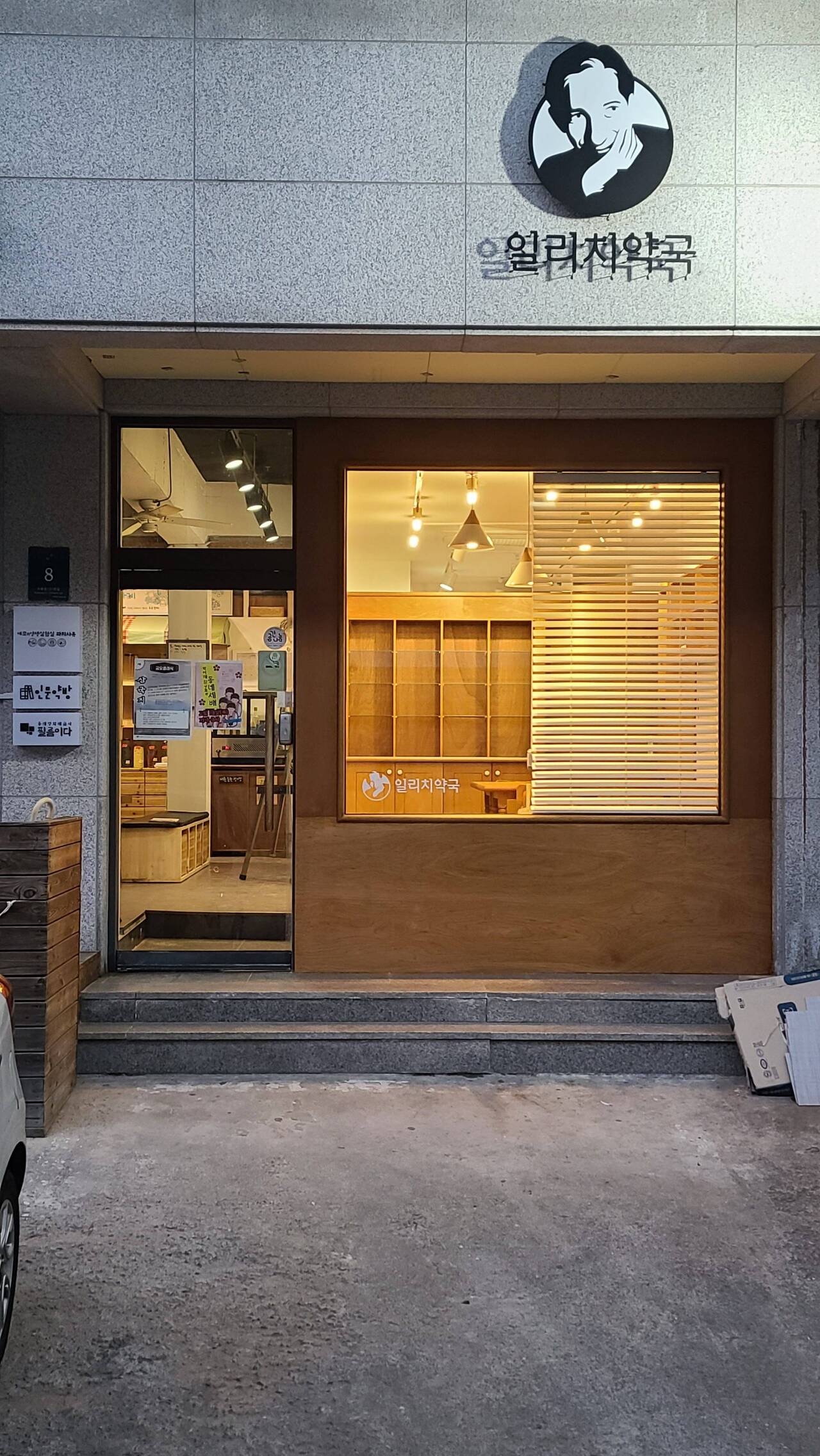 누구는 어디선가 가구를 들고 와선 “이거 여기다 놓자”고 하고, 누구는 계획에 없던 주문을 하고…. 난 쏟아지는 이 비계획적인, 그리고 한 가지밖에 생각할 줄 모르는 요구들을 들을 때마다 한숨을 푹푹 쉬며 ‘전체를 디자인 한다’라는 생각을 조금씩 포기 ‘당했다’. 너무 많은 사람과 단위들, 욕망들, 이걸 하나의 디자인으로, 통일성을 부여하고 싶단 생각은 욕심이었던 걸까? 난 생각을 바꿨다. ‘일리치 약국만이라도 잘 하자’. 그러나. 길드다의 사장님이자 일리치 약국의 사장님이기도 한 이희경 선생님은 공사 막바지에 갑자기 굴러다니던 칠판을 주워 나에게 오시더니, “이걸 반으로 잘라서 하나는 입간판을 만들고, 하나는 내부 간판을 만들라”고 하셨다. “여기가 뭐하는 곳인지를 모르겠어!” 왜 이걸 이제 말 하냐는 이야기는 씨알도 안 먹힐 것이었다. 남은 칠판을 왜 저기에 두었을까 후회해도 이미 늦었다.