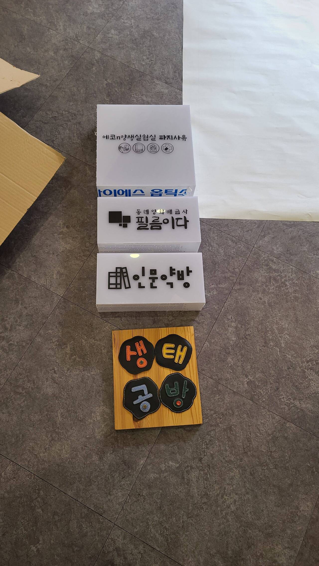 그러나 이것은 끝이 아니라 시작이었다. 공사가 막바지로 가고, 어느 정도 마감이 되고 끝이 보이기 시작하자 속속 사람들이 등장했다. 그 다음은 ‘생태 공방’의 달팽이님이 고집을 부리기 시작했다. “우리는 간판을 이걸 달아야 해!” 난 외부의 유입이 중요한 일리치 약국엔 특히 가게의 얼굴인 파사드(건축물의 주된 출입구가 있는 정면부)가 중요하다고 생각했고, 비교적 공동체 내부 활동인 다른 단위들에는 통일성을 부여해 일리치 약국이 강조되면 좋겠다고 생각했다. 그러나 이런 나의 계획에 빠듯한 공사비를 생각하면 충분한 예산 확보가 어려웠기 때문에, 나는 공사를 통해 버는 내 인건비의 일부를 간판 제작비용으로 사용하기까지 했다. 그러나 이들은 나름의 디자인으로 간판을 만들어둔 것이다.