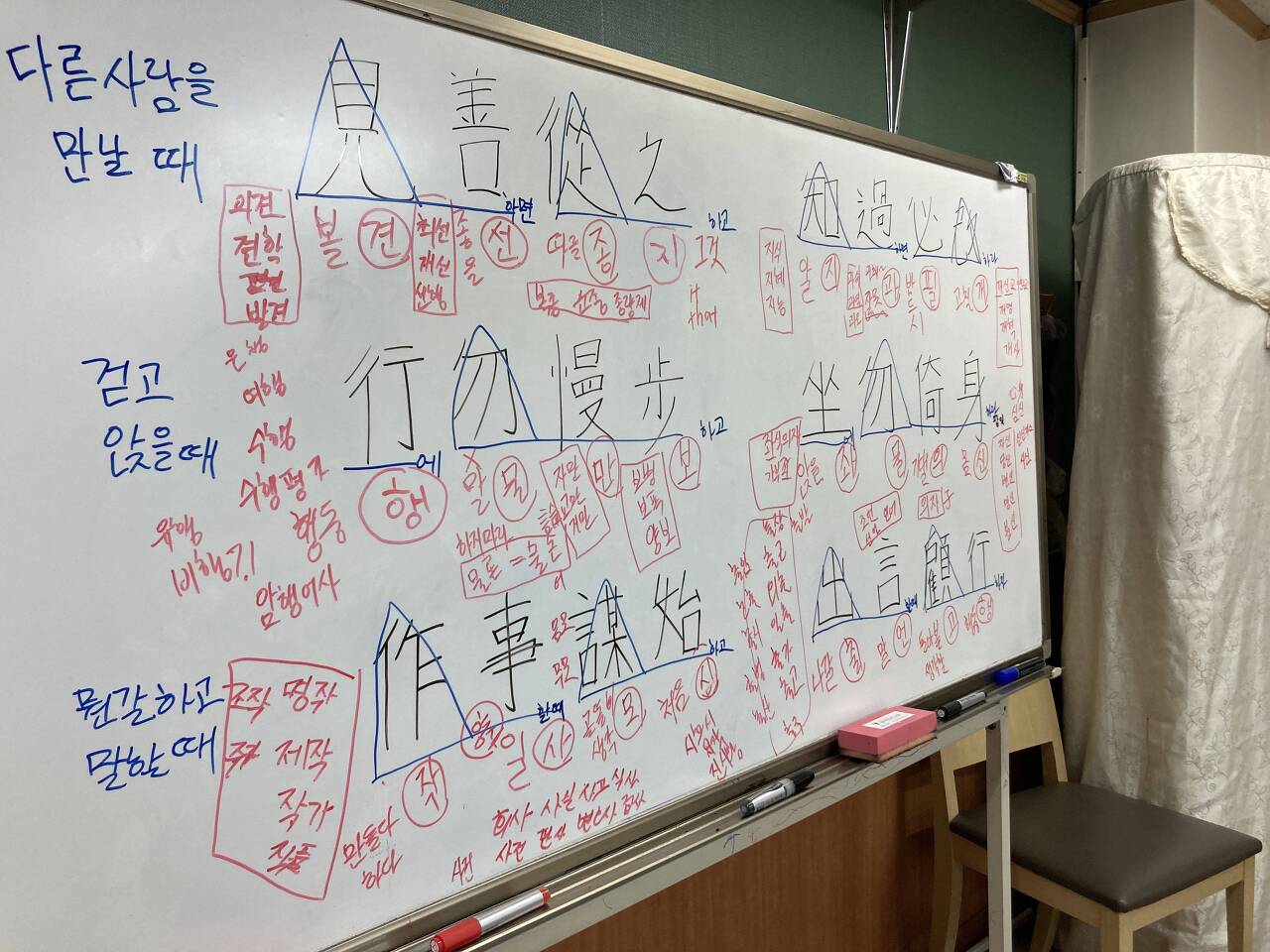 홀수 시간에는 설명에 해당하는 강의를 진행하는 시간입니다. 그리고 이 시간에는 사자소학의 문장에 들어가는 한자들의 의미와 음을 함께 맞추고 알아가는 시간이에요. 한자들의 갯수는 정말 셀 수 없이 많다는 건 알고 계실겁니다. 하지만 결국 언어고 문자다보니 그 사용 빈도가 높은 것은 따로 있죠. 사자소학에도 마찬가지입니다. 예를 들면 見, 行 出, 作같은 단어들은 정말 많이 쓰이는 문자입니다. 오죽하면 한자로 변환할 때 가장 먼저 나오는 문자들이기도 하고요. 하지만 이에 비해서 慢, 謨, 顧 같은 문자들은 비교적 적게 쓰일 뿐만 아니라 특유의 의미를 담은 문자입니다. (지나간 것을 의미하는 過와 지나간 것을 반추하고 돌이켜보는 顧은 어떻게 보면 서로 비슷하지만 섬세한 차이가 제가 생각하는 한자의 매력이라고 생각해요.)