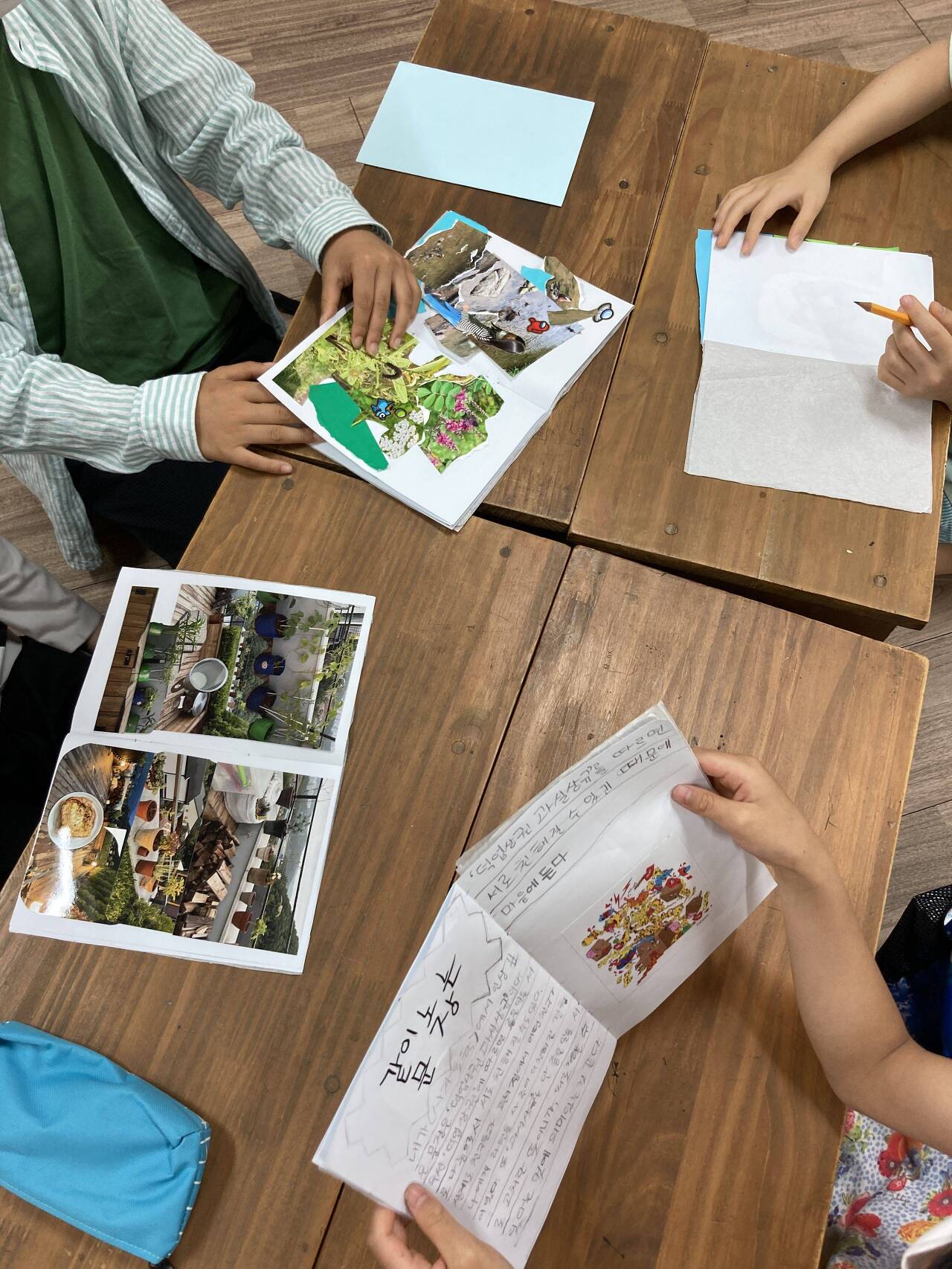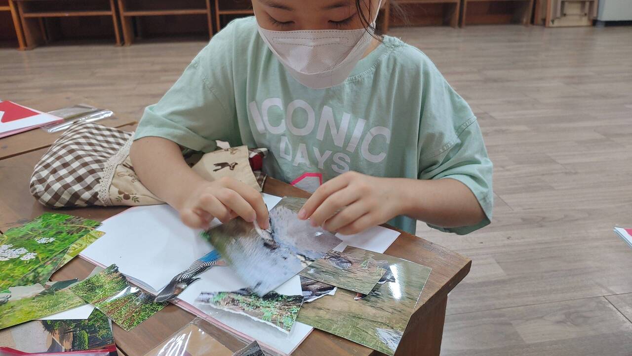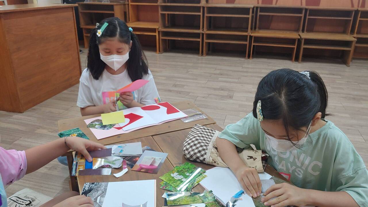 저는 친구들이 찍은 사진으로 콜라주 작업 하는 걸 도와주고 고은쌤은 친구들의 작가 데뷔를 위해 글 쓰는 걸 도와주는 작업을 했습니다.
