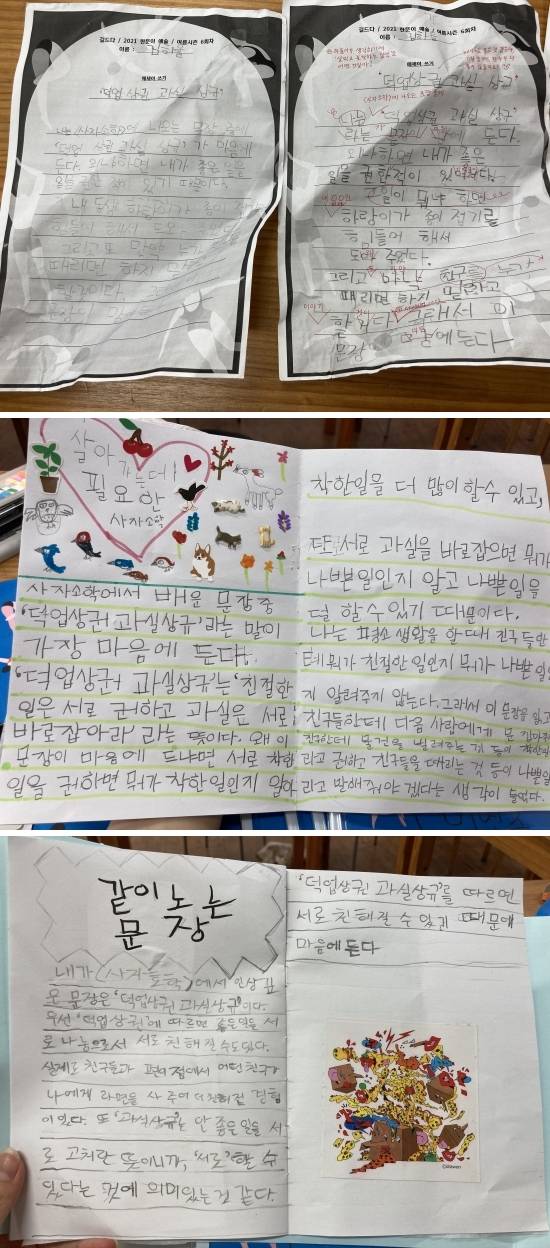 이렇게 콜라주와 글쓰기를 모두 마친 친구들은 모두 모여서 서로의 글과 작품을 돌려보는 시간을 가졌습니다.
