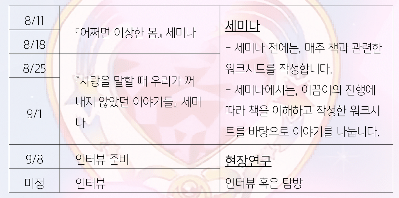 * 기간 및 시간: 8/11~9/15, 수요일 저녁 7시 30분 ~ 9시(+30분)
