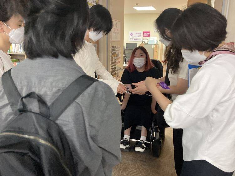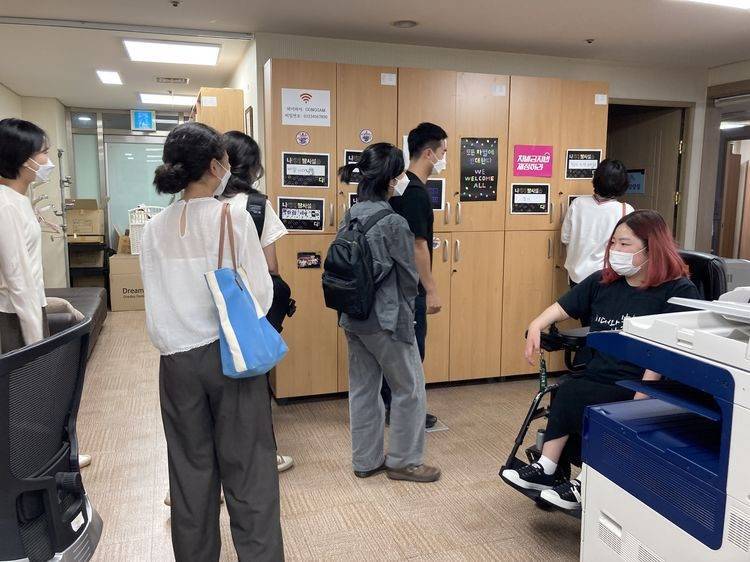 마지막 시간에 <장애여성공감>에 다녀왔습니다. 5주간 온라인으로만 진행하다가 처음으로 오프라인으로 얼굴을 보는 자리였는데요. 어색할줄 알았는데 생각보다 서로가 친숙하게 느껴졌습니다. 건물이 꽤 복잡해서 만나는데 애를 먹었지만, 늦지 않게 <장애여성공감>에 도착할 수 있었습니다. 무려 근무하시는 날이 아닌 일요일에 활동가 두 분께서 저희를 맞이해주셨는데요. 정말 너무 감사한 일이 아닐 수 없었습니다. 교육장에서 <장애여성공감>에 대한 소개를 듣고, 저희 인터뷰를 진행한 뒤, 간단하게 공간을 둘러보았습니다. 2시간 30분이 걸린 꽤 긴 여정이었답니다.