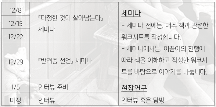 우리는 6주간 동물을 어떻게 만나면 좋을지, 어떻게 함께 살아갈 수 있을지에 대해 책을 읽으며 질문을 이어나가고, 먼저 고민하고 행동하고 있는 사람들을 만나 시야를 확장해봅니다.