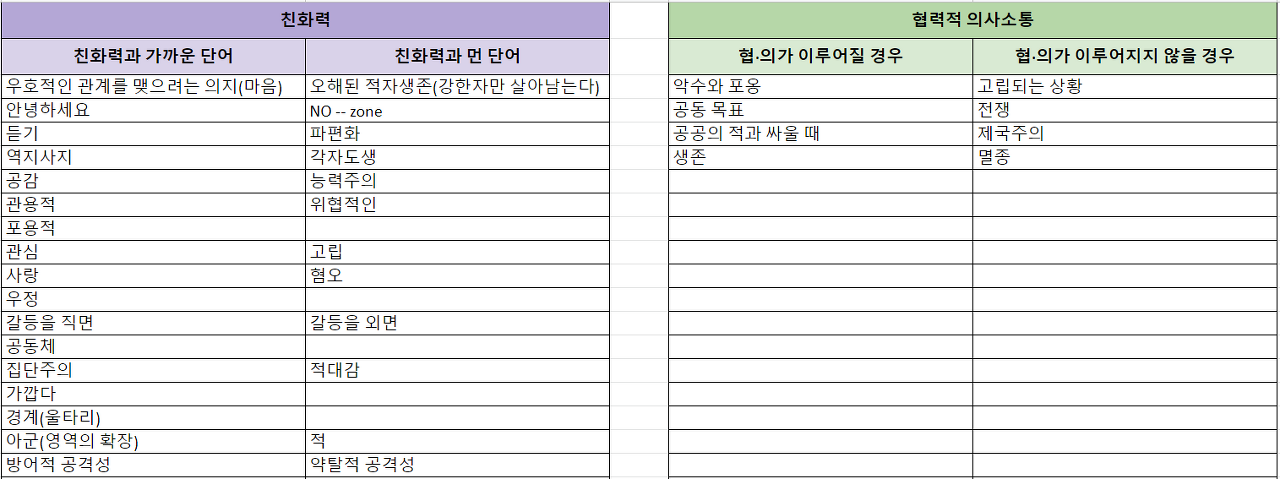 그 다음으로는 책에 나오는 중요한 개념인 ‘친화력’과 ‘협력적 의사소통’을 함께 고민해보는 시간을 가졌어요. 책에 자주 등장하는 중요한 단어들인데 일상적인 용어와 섞여서 오해될 여지도 많았기 때문에 공통감각을 만들어보려고 했어요.